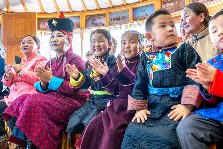 宣讲一结束,演员们马上动手,把小舞台搭起来。铺毡子、调音响、立琴架,几分钟便把一个普通的蒙古包变成了紧凑的演出空间。孩子们占据了第一排,老人靠在后面,牧民们的欢声笑语把缝隙都填得满满当当。风还在外面呼呼地叫,屋子里却已经暖烘烘了。