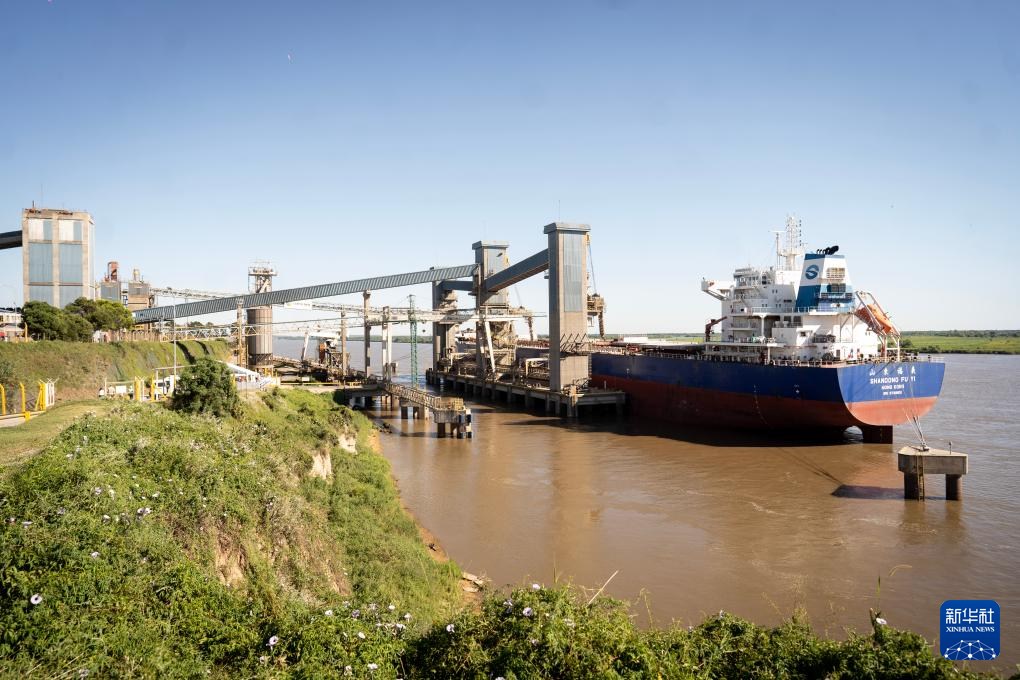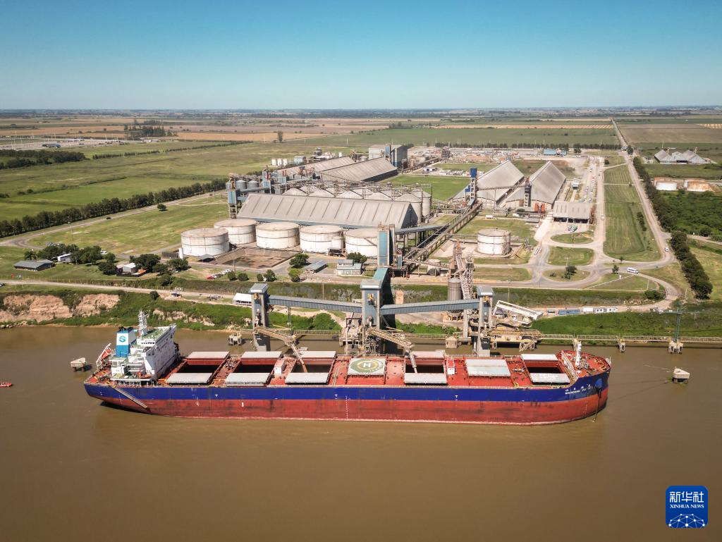 这是12月13日在阿根廷圣菲省廷布埃斯港拍摄的装载小麦的货轮。新华社发(马丁·萨巴拉摄)