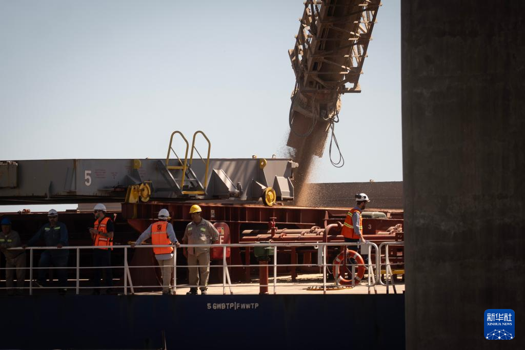 12月13日,在阿根廷圣菲省廷布埃斯港,工作人员在一艘装载阿根廷小麦的货轮旁工作。新华社发(马丁·萨巴拉摄)