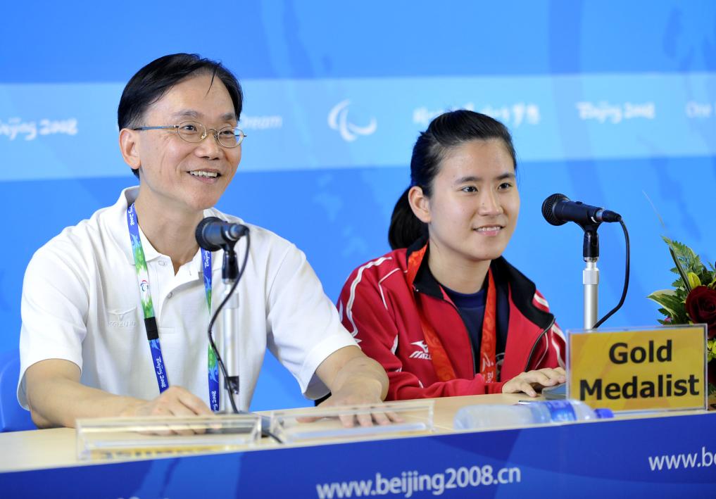 2008年9月9日,郭海莹(右)和父亲郭克荣一同在新闻发布会上接受记者采访。新华社记者 朱峥 摄