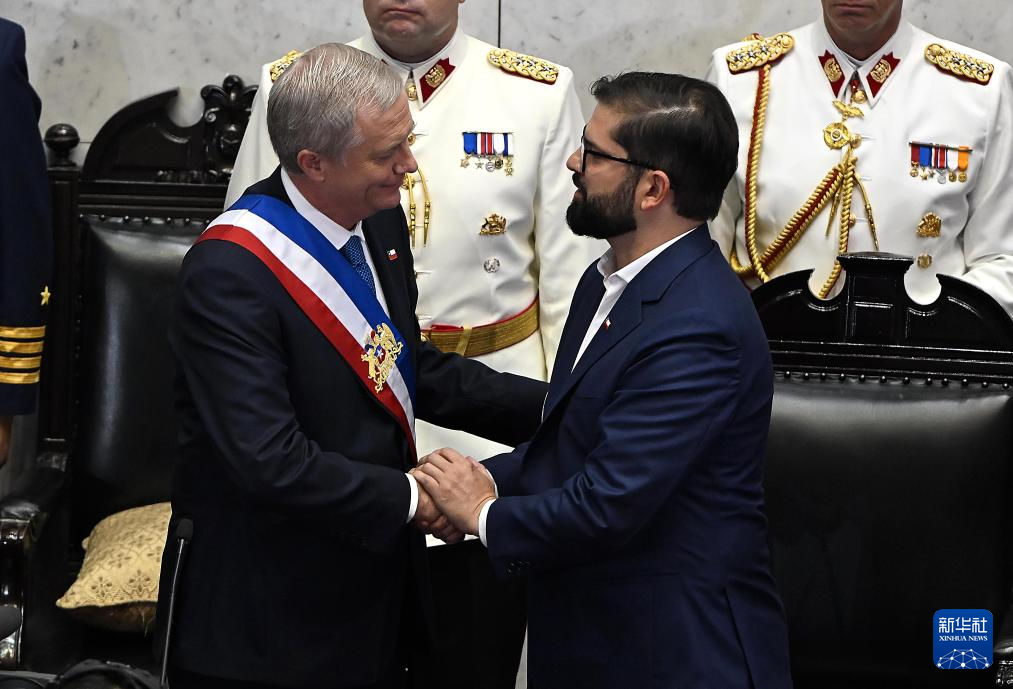 3月11日,在设于智利第二大城市瓦尔帕莱索的国民议会,智利总统何塞·安东尼奥·卡斯特(左)在总统权力交接仪式上与卸任总统博里奇握手。新华社/智利一号通讯社