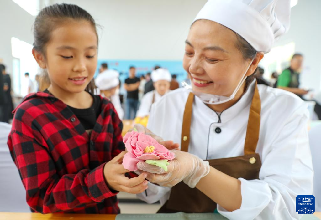 9月27日,一名小朋友在现场学习制作花样馒头。