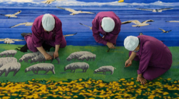 9月28日,甘肃省定西市安定区幼儿园的小朋友在绘制《我爱你中国》长卷。