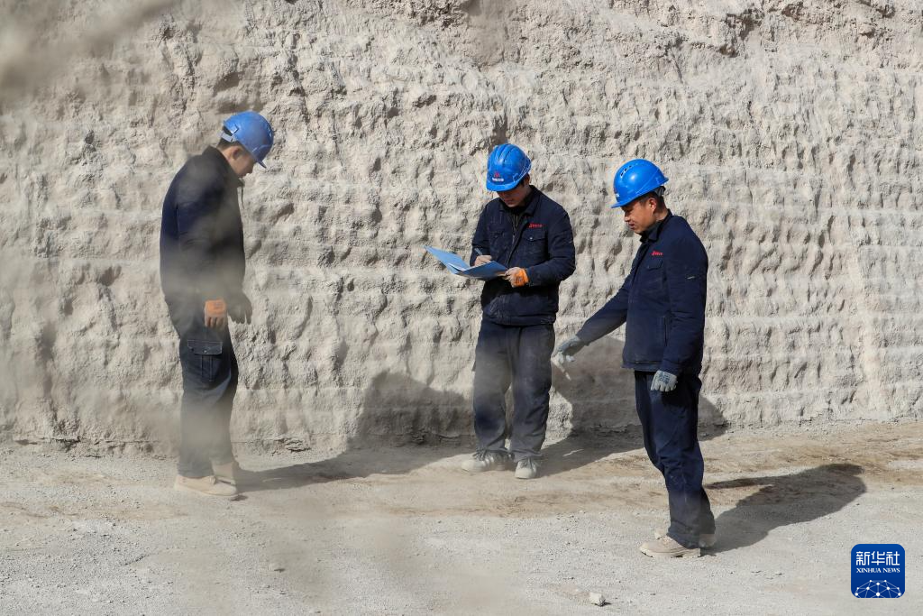 11月18日,敦煌研究院文物保护技术服务中心工作人员观察西墙马面的夯筑支顶加固效果(无人机照片)。