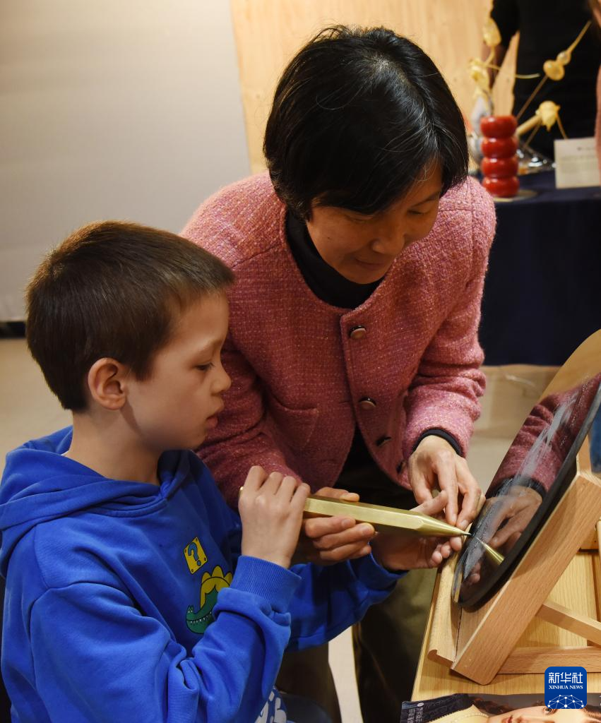 11月26日,在荷兰海牙中国文化中心,一名小朋友体验石影雕技艺。