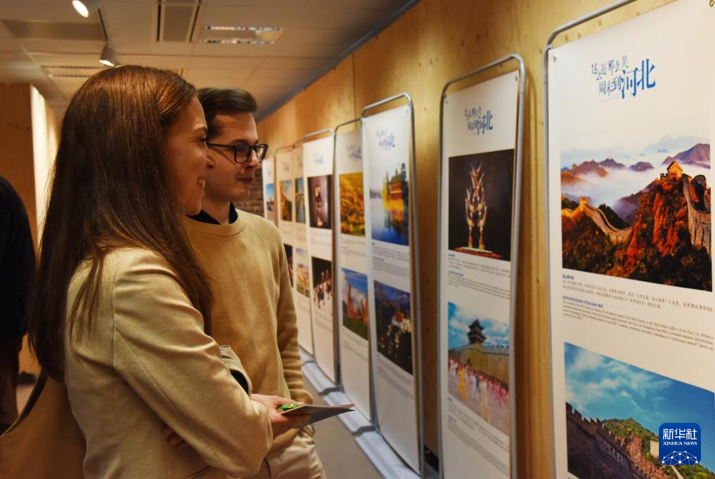 11月26日,在荷兰海牙中国文化中心,嘉宾观看河北文旅展板。