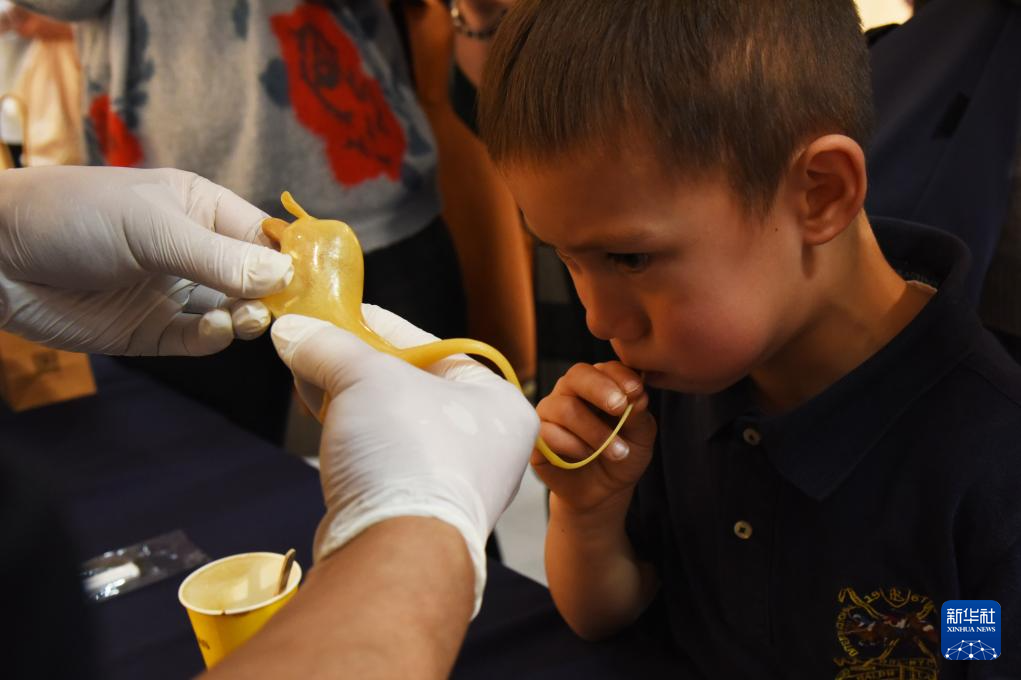 小朋友们围着糖人艺人刘兴旺,看着热乎乎的糖浆在刘师傅手里变成一个个活灵活现的小动物,激动不已。在刘师傅指导下,孩子们纷纷上阵,鼓起腮帮子使劲吹。