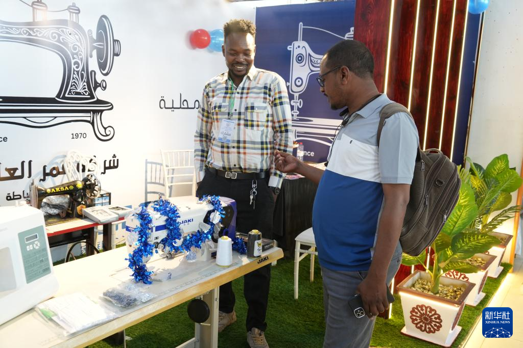1月27日,在苏丹尼罗州阿特巴拉市举办的展览上,一名缝纫机制造商向参观者介绍产品。