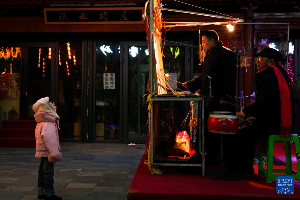 幕布轻挂,灯影流转,河湟皮影的独特唱腔在青海省西宁市城北区“冰雪烩”活动现场悠扬传开。俯身于幕布后翻飞皮影的,是河湟皮影戏国家级非物质文化遗产代表性传承人周邦辉。这已是他和皮影社今年在西宁“进城”演出的第5场。