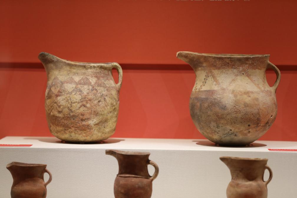 到了展厅后段,彩陶图案显得更加简练。几何形纹成为主调,有的杯、罐上只留下寥寥几笔,但器型更加多元——带单耳的陶豆、带流的陶罐相继出现,线条中隐约可见草原文化的影子。
