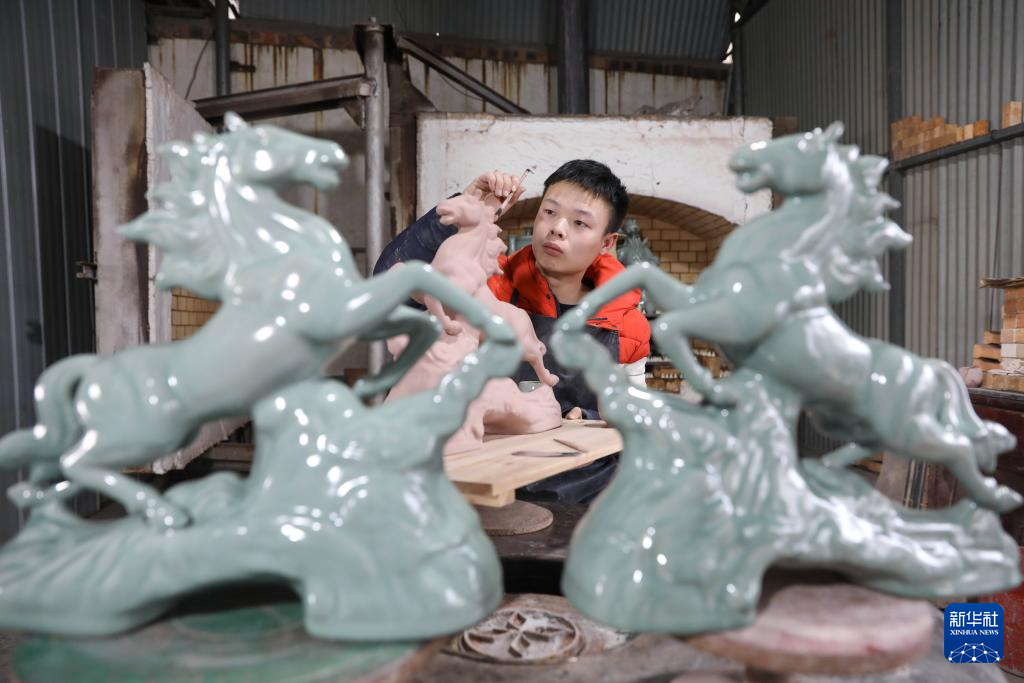 2月3日,河南省平顶山市宝丰县大营镇汝瓷艺人刘朝飞在为生肖马系列产品修釉。