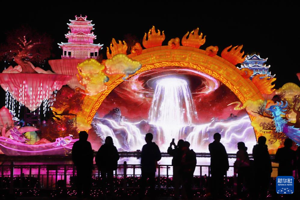 2月2日,游客在“欢乐光域·厦门园博苑灯会”上赏灯游玩。
