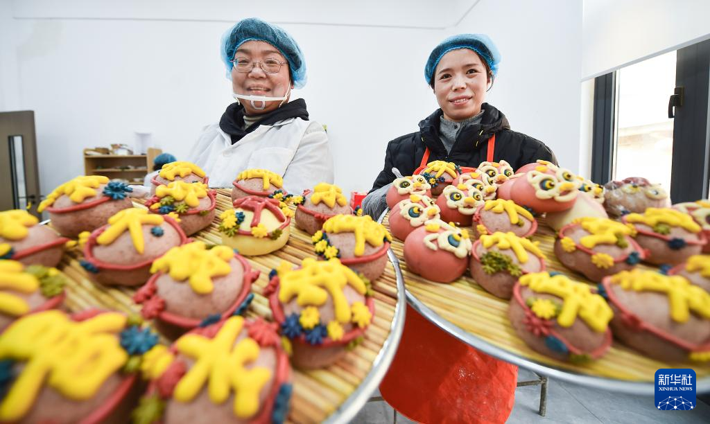2月4日,在河南省洛阳市西工区红山街道枣园社区花馍工坊内,工人展示制作好的花馍。