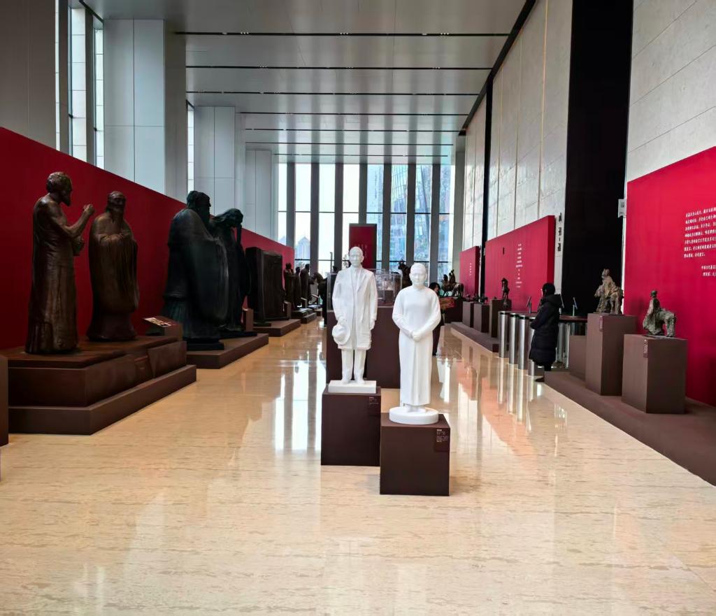眼前这一座座雕像,塑圣人取其仁厚之魂,眉眼温润、身形端方,将“仁者爱人”的哲思凝于其中;刻诗人抓其浪漫之韵,衣袂翻飞、神态洒脱,以写意线条勾勒“孤鹜落霞”的诗意。塑革命先驱凝其浩然之气,取其最具张力的一瞬,或昂首赴义,或沉着奔走,不屈的意志与信念从劲瘦的躯体中磅礴而出,熔铸为民族危难时的不朽长城。