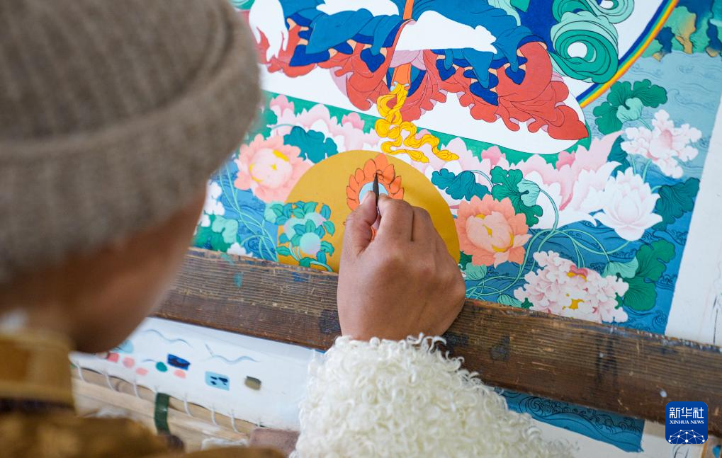 2月10日,学徒在西藏唐卡画院的教室里画唐卡。