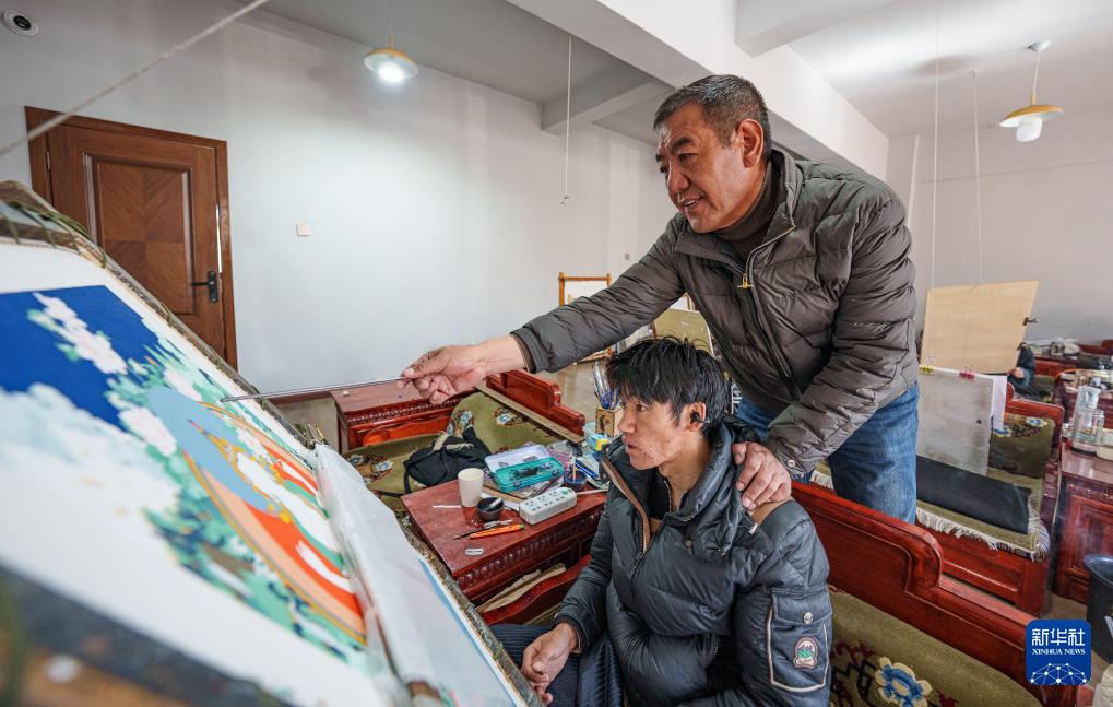 2月10日,罗布斯达在西藏唐卡画院的教室里指导学徒画唐卡。