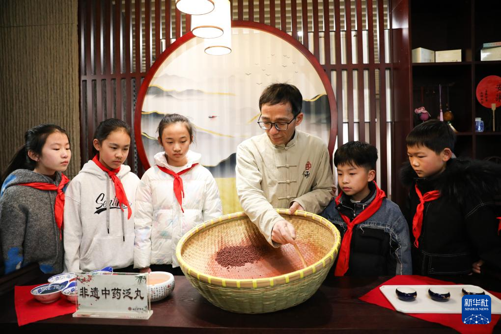 3月15日,江苏省海安市南屏小学学生走进市中医院中医药博物馆,在中药师带领下辨识中药材、观看中药丸制作展示,体验中医药文化。
