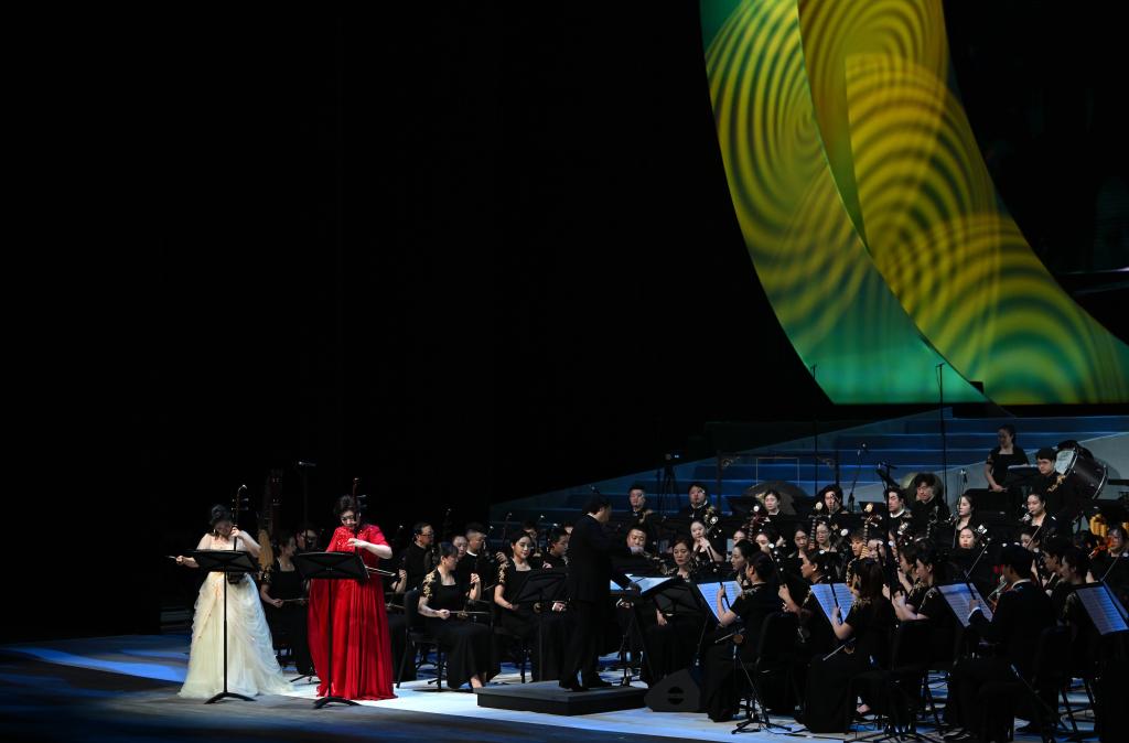 10月16日,胡琴表演艺术家宋飞(前右)、张钟云(前左)在第十一届丝绸之路国际艺术节开幕式上表演。