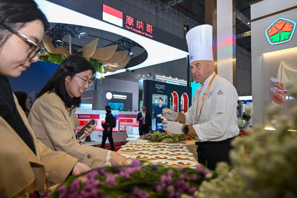 11月5日,人们在第八届进博会国家展上品尝特色美食。