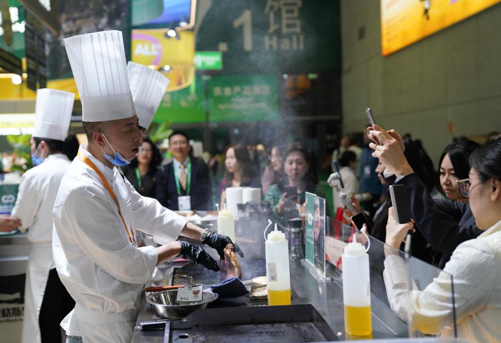 11月5日,参展商工作人员在第八届进博会农食产品展区现场制作食物。