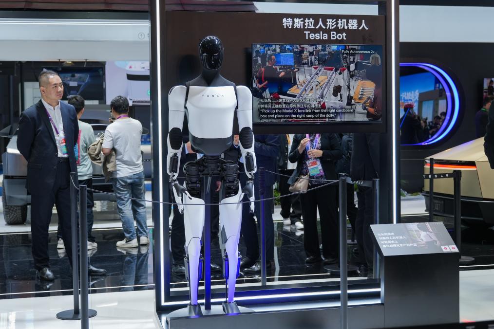 这是11月5日在第八届进博会汽车及智慧出行展区特斯拉展台拍摄的特斯拉人形机器人。