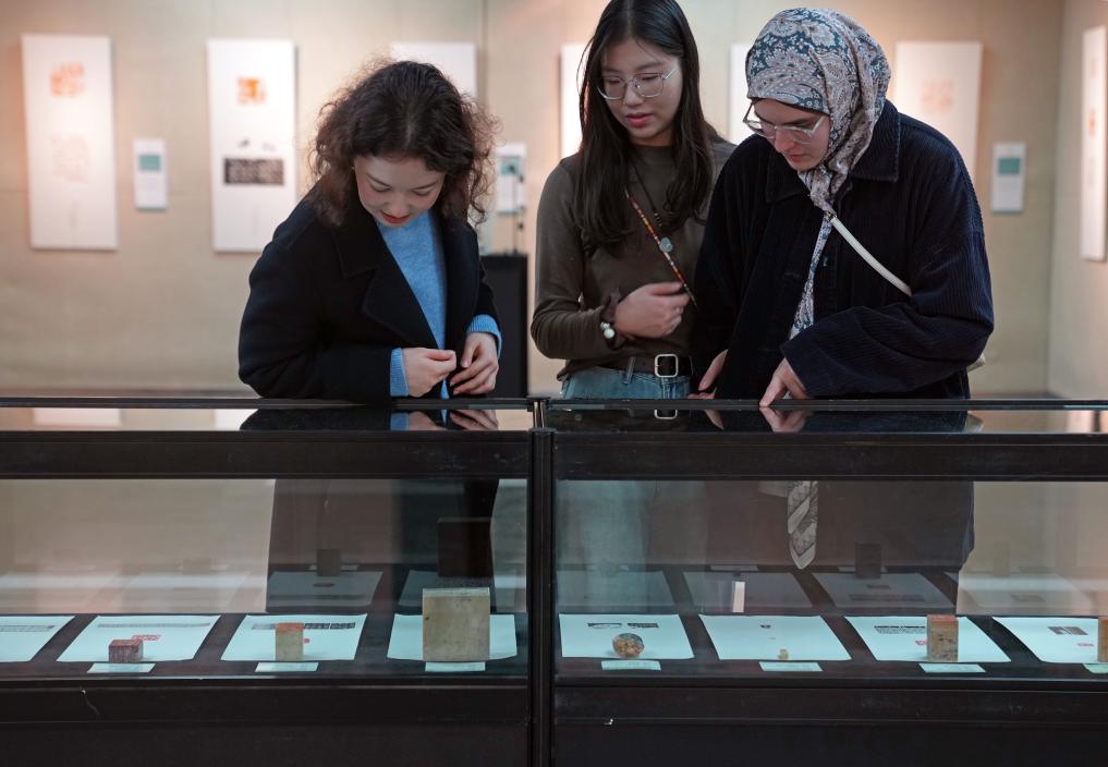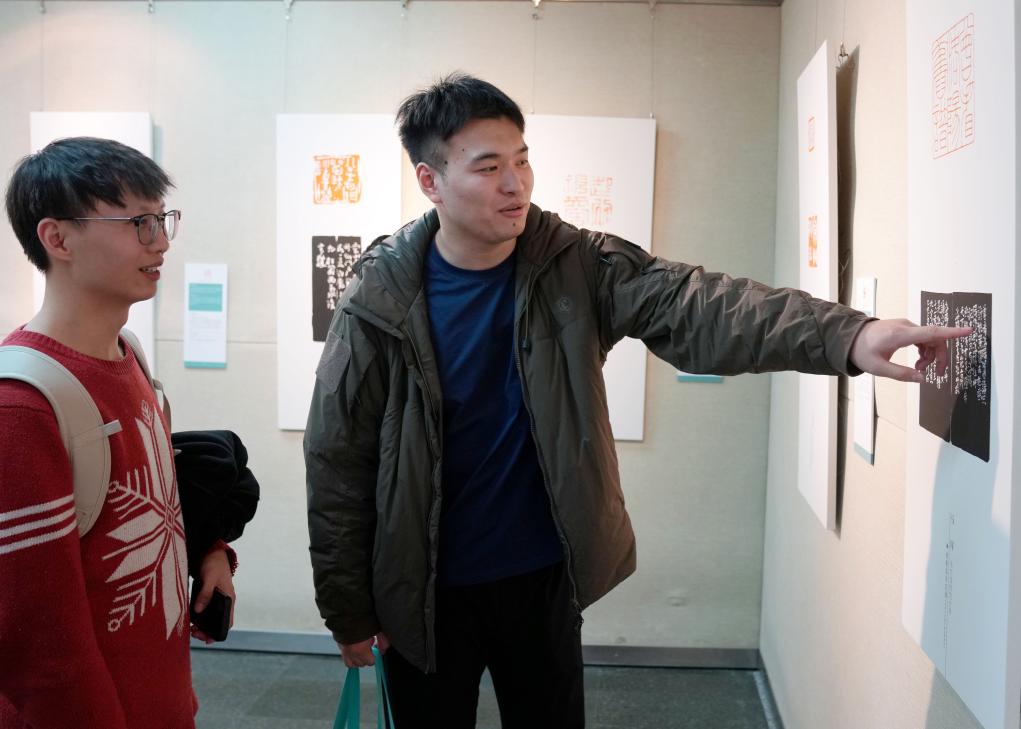 12月19日,在篆刻工作坊,参展学生进行篆刻展示。