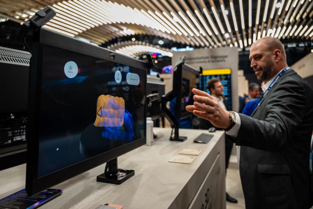 2月3日,在西班牙巴塞罗那,一名男子借助一款屏外传感器与屏幕交互。