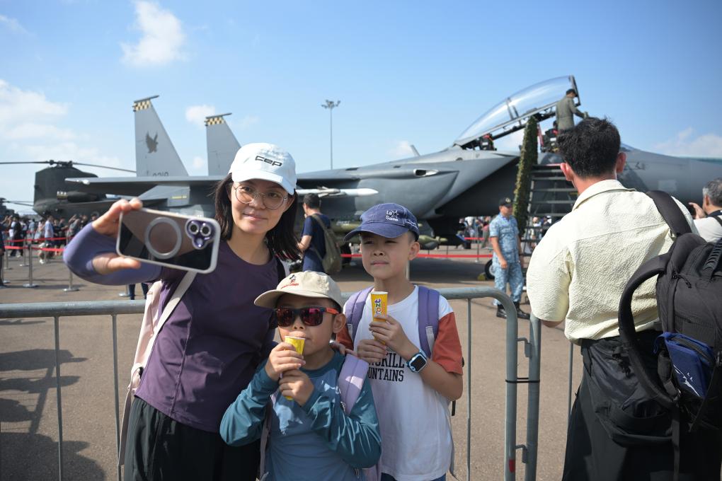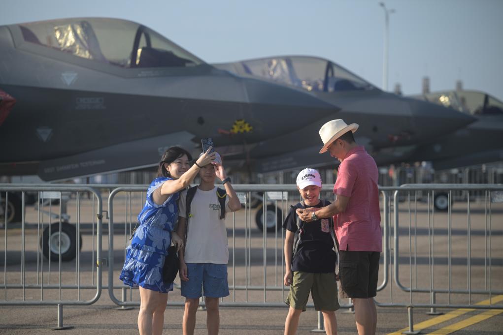 2月7日,在新加坡樟宜展览中心,观众在第十届新加坡航展上拍照留影。