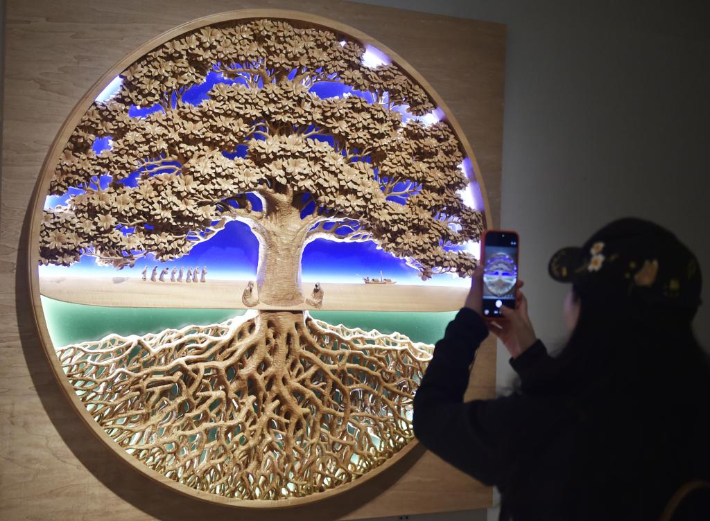 3月23日,参观者在中国美术馆拍摄展出的木雕展品《生万物》。
