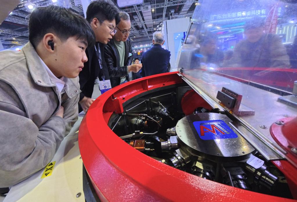 3月23日,参观者近距离观看一款转台式多工位柔性复合机床展品。