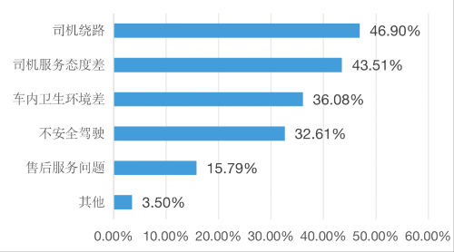 调查结果显示,消费者选择网约车时,最担心遇到“司机绕路”(46.90%)和“司机服务态度差”(43.51%)等服务提供者的道德风险。在实际消费中,消费者最常遇到的是“不合理收费”(38.35%)和“系统定位不准”(33.25%)等运营层面问题。