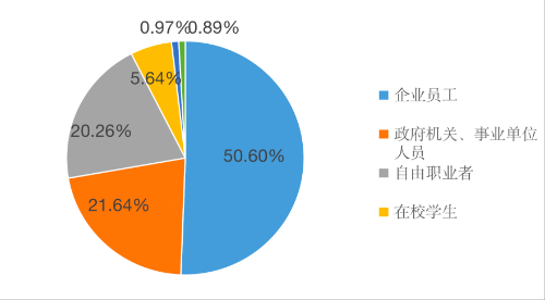 在有网约车消费经历的受访者中,年龄在18-45岁之间的中青年人占到近八成(78.39%),企业员工(50.60%)、政府机关及事业单位人员(21.64%)、自由职业者(20.26%)等在职人员占比超过九成(92.50%)。
