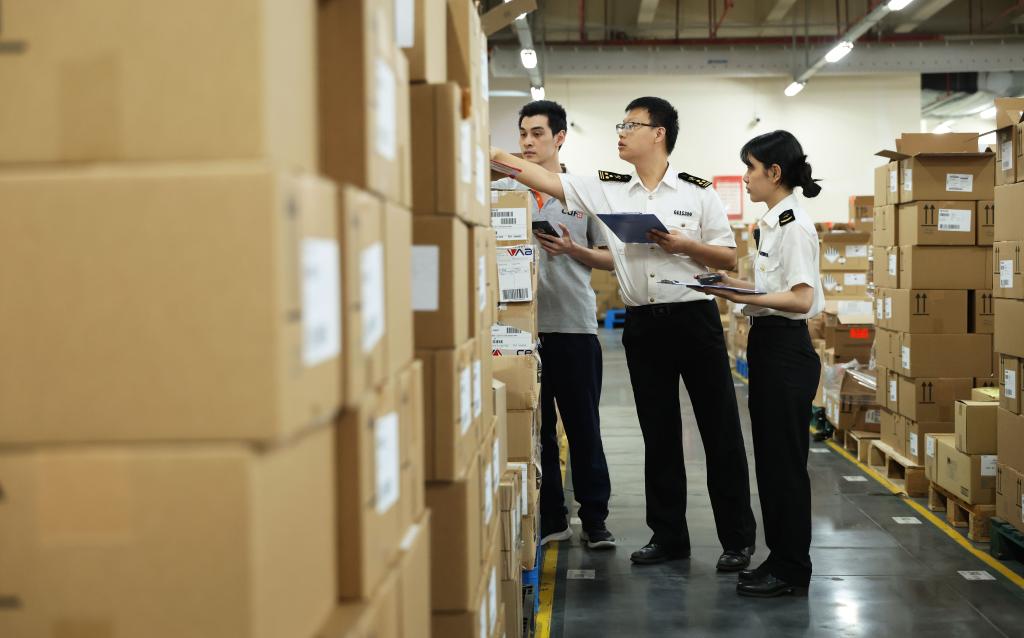 2025年6月1日,在海口综保区中免海南国际物流中心,海口海关所属马村港海关关员巡查免税品仓库(5月26日摄)。新华社记者 金皓原 摄