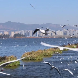 每到冬季,在云南省昆明市滇池畔的海埂大坝、海洪湿地等地,红嘴鸥成群结队在空中翩翩起舞,成为春城昆明的一道靓丽风景。