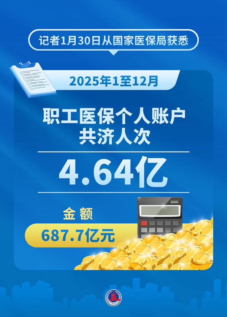 新华社北京1月30日电(记者彭韵佳)记者1月30日从国家医保局获悉,2025年1至12月职工医保个人账户共济人次4.64亿,金额687.7亿元。