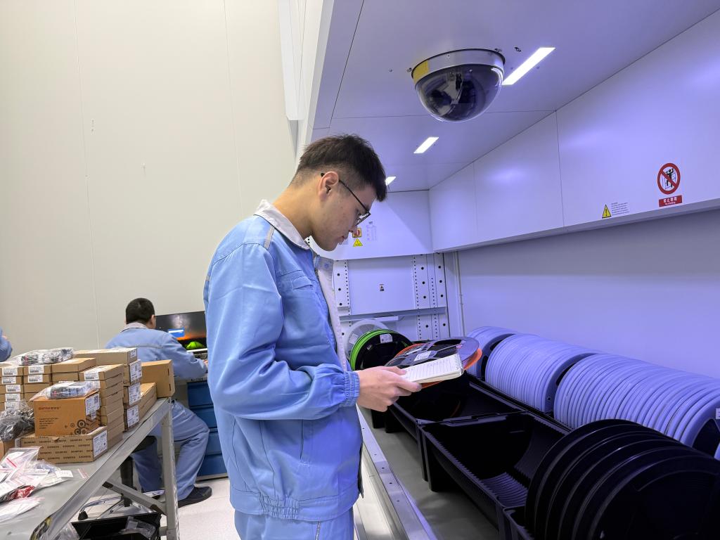 近日,在交控技术装备有限公司的智能生产车间内,工作人员正在核对出库物料。新华社记者 徐思钰 摄