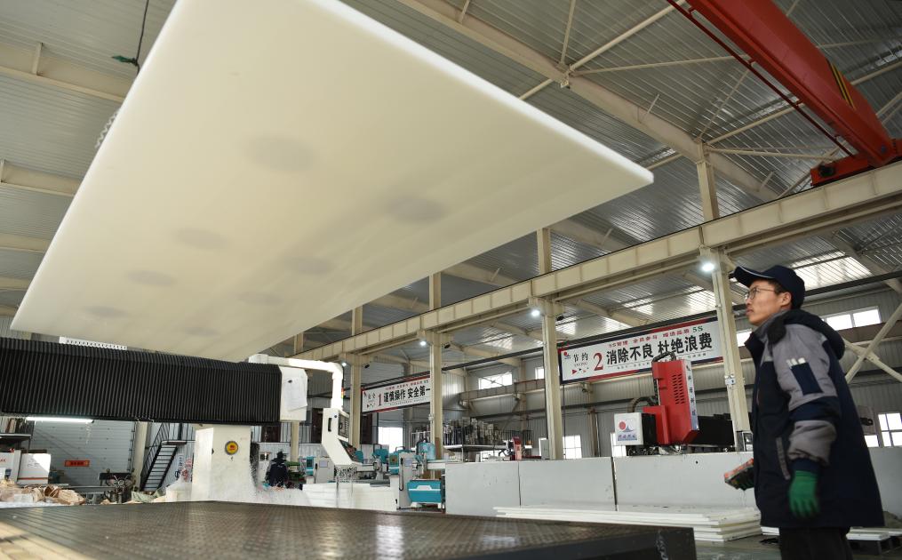 图为河北省张家口市科诺工程塑料有限公司工人在仿真冰板生产线上工作。新华社发(陈晓东 摄)