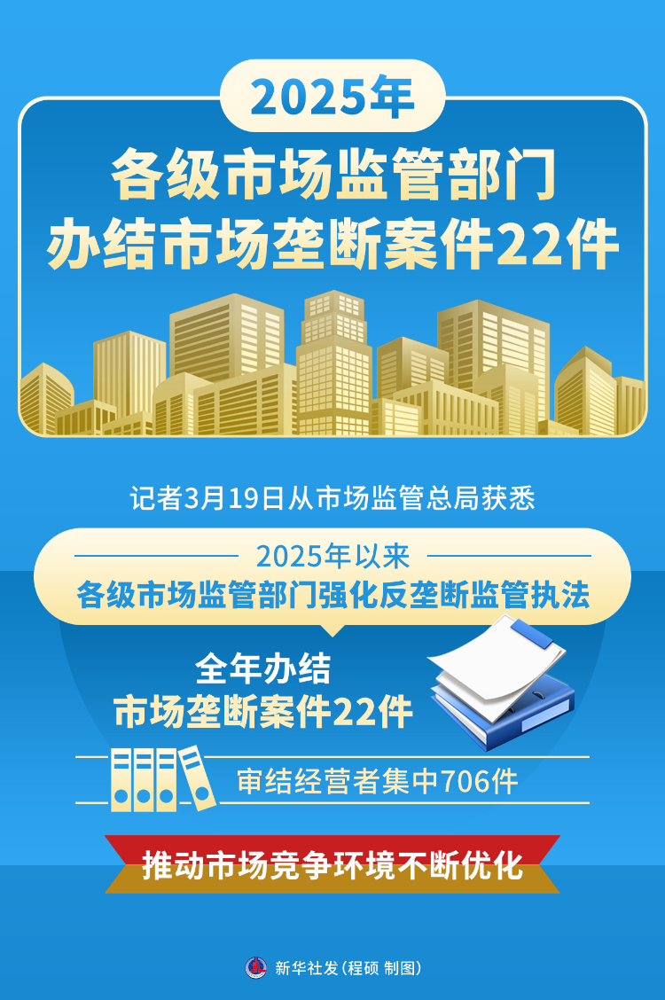 新华社北京3月19日电(记者王悦阳、赵怡宁)记者3月19日从市场监管总局获悉,2025年以来各级市场监管部门强化反垄断监管执法,全年办结市场垄断案件22件,审结经营者集中706件,推动市场竞争环境不断优化。