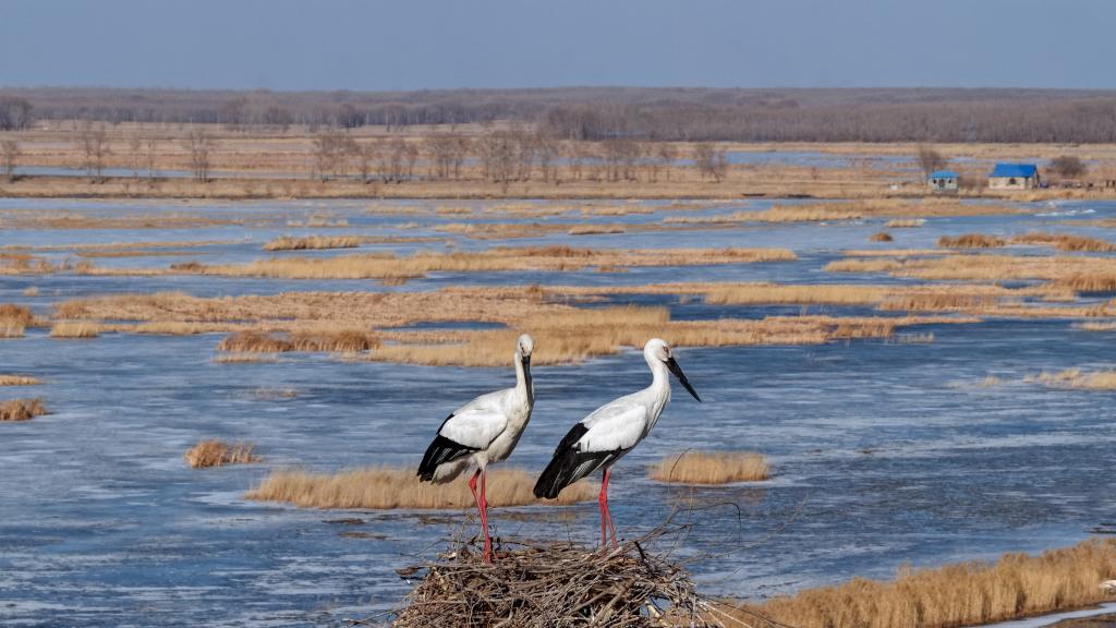 吉林省莫莫格国家级自然保护区内,东方白鹳在筑巢。新华社发(潘晟昱 摄)