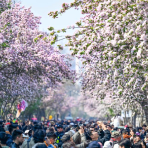 4月4日,游客在天津市五大道历史文化街区游览赏花。新华社记者 赵子硕 摄