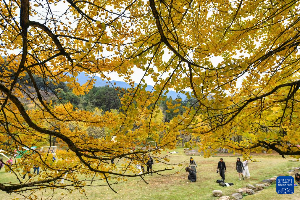 11月14日,游人在湖南省永州市双牌县茶林镇桐子坳村古银杏林赏景游玩。