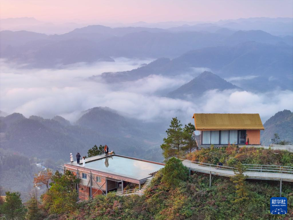11月15日,游人在贵州省开阳县高寨苗族布依族乡牌坊村欣赏晨景(无人机照片)。