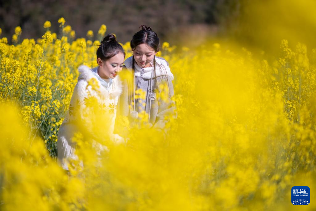 2月22日,在云南省文山壮族苗族自治州马关县夹寒箐镇上布高村,游人在油菜花海中感受春光。