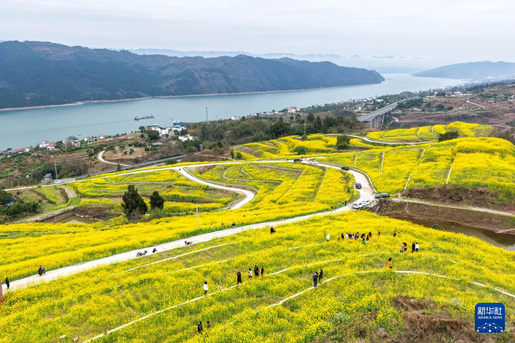 随着气温回升,重庆市丰都县高家镇汶溪社区长江沿岸的600亩油菜花竞相绽放,吸引游客前来踏青赏花。