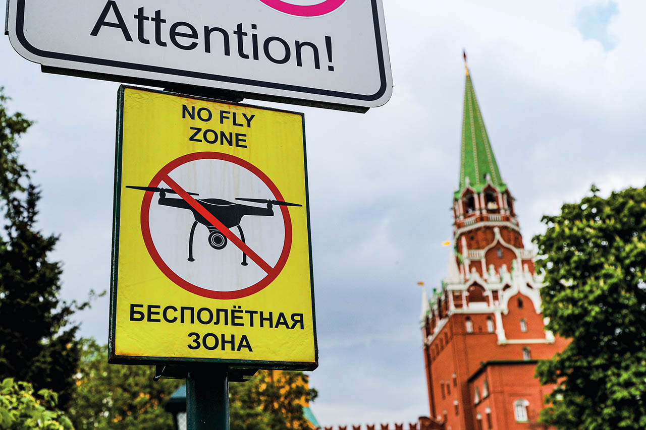 2023年5月3日在俄罗斯首都莫斯科克里姆林宫附近拍摄的禁飞无人机标识