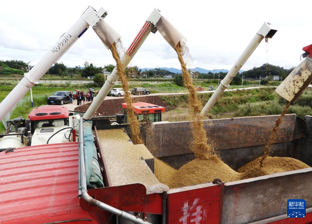 10月22日,农民在河南省信阳市光山县罗陈乡张楼村抢收水稻。