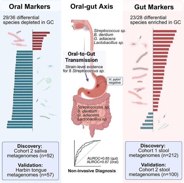 在此基础上,研究首次描绘了胃癌患者从口腔到肠道的完整微生物组图谱,揭示了“口腔-胃-肠道”连续性的菌群失调轴。以上发现,与经典的“启动子-促进子”(initiator-promoter)胃癌发病模型假说吻合: