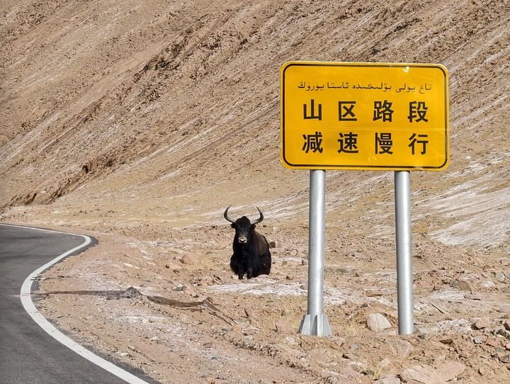 翻越最后一座达坂,临近保护区出口,一只野牦牛静静蹲在路牌边,仿佛等候多时。它晃了晃硕大的头颅,作势前冲,旋即转身奔入荒野。(贺小童)