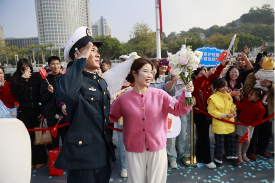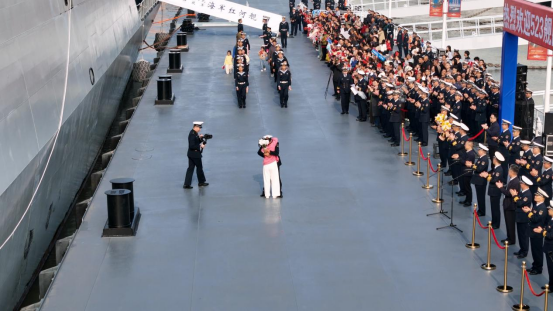 12月21日,海军红河舰圆满完成第47批护航编队任务,返抵母港。军港码头上,数百名官兵家属翘首以盼,除了载誉而归的喜悦和久别重逢的热泪,一场“迟到”的婚礼,让凛冽的冬日军港再次漾起温暖的涟漪。