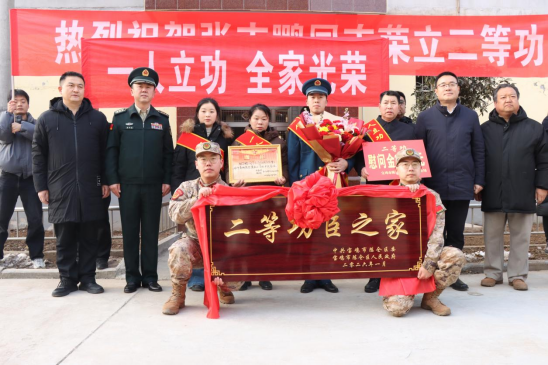 近日,陕西省宝鸡市陈仓区东关街道南阳村锣鼓喧天、热闹非凡,由陈仓区区委书记和区人武部部长等领导组成的送喜报小分队为辖区二等功臣张志鹏家人送上沉甸甸的二等功喜报和“二等功臣之家”牌匾。